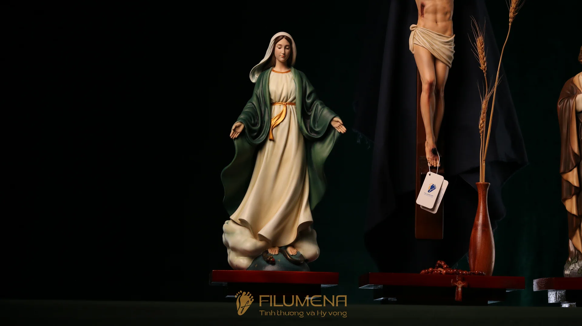 Bộ bàn thờ Chúa bằng gỗ 3 kệ 3 tầng được thiết kế cho bộ 3 tượng Công giáo Filumena. Xin vui lòng xem thêm thông tin về các tác phẩm tượng Công giáo Filumena đi cùng với bàn thờ này.