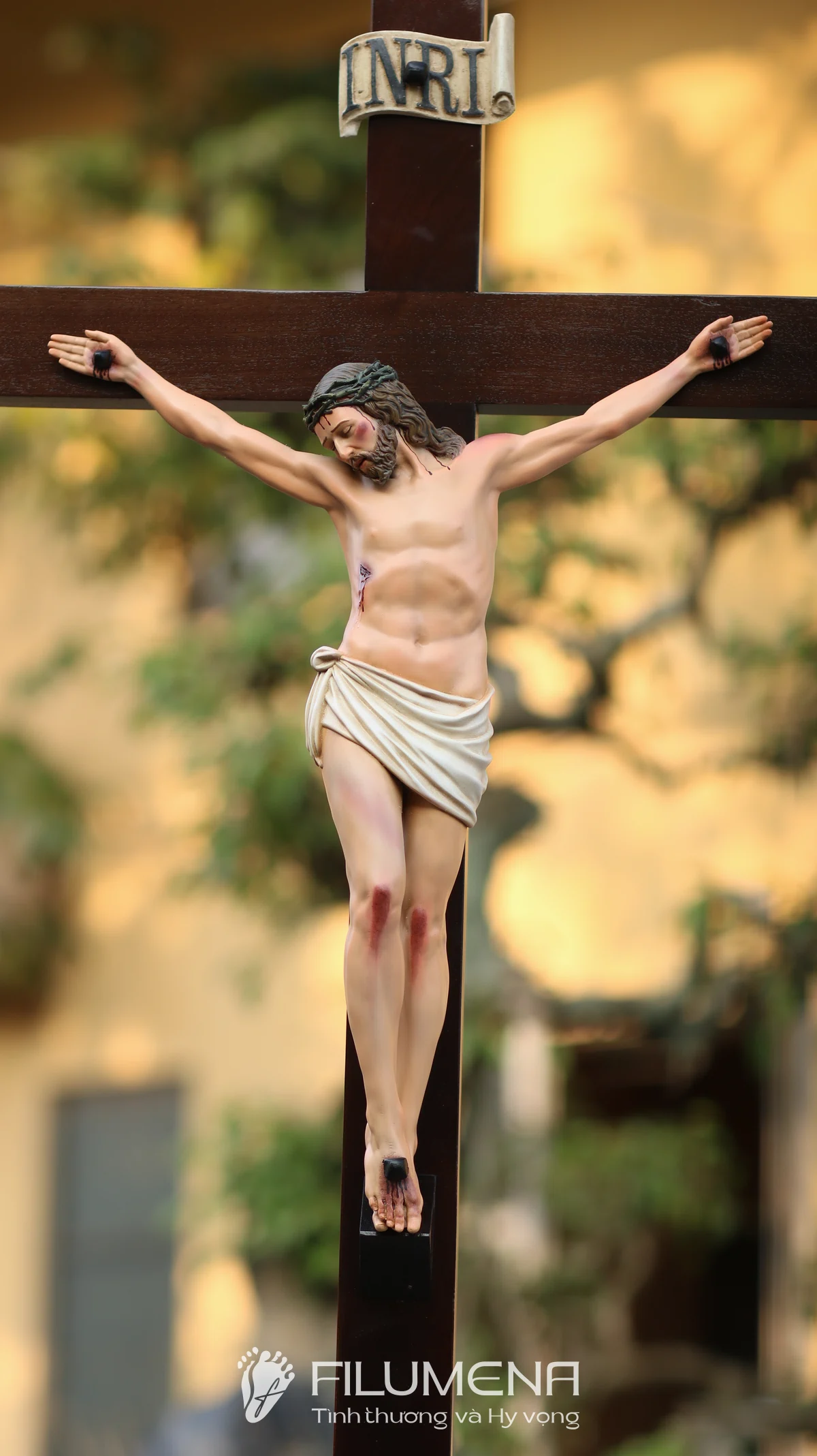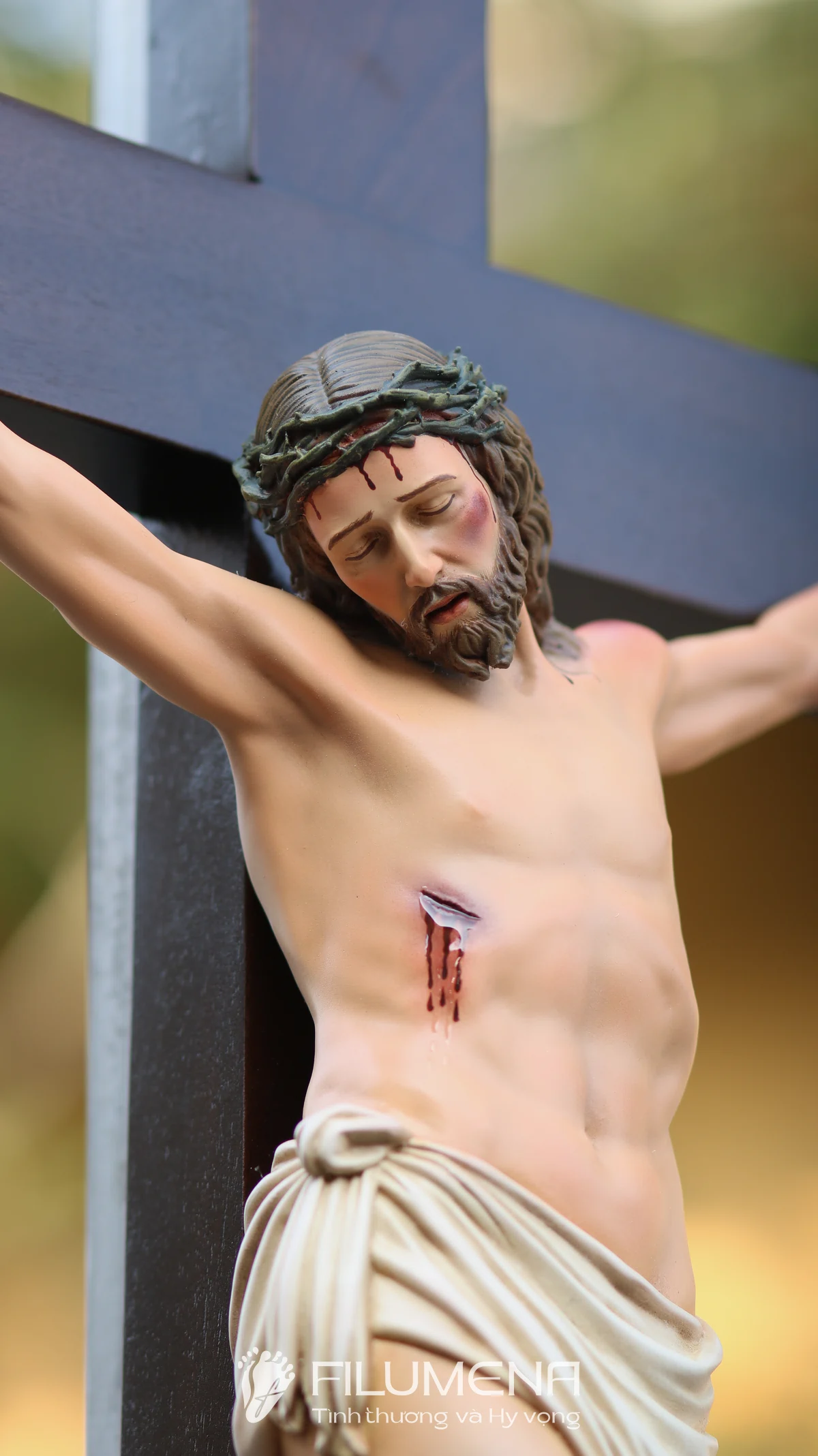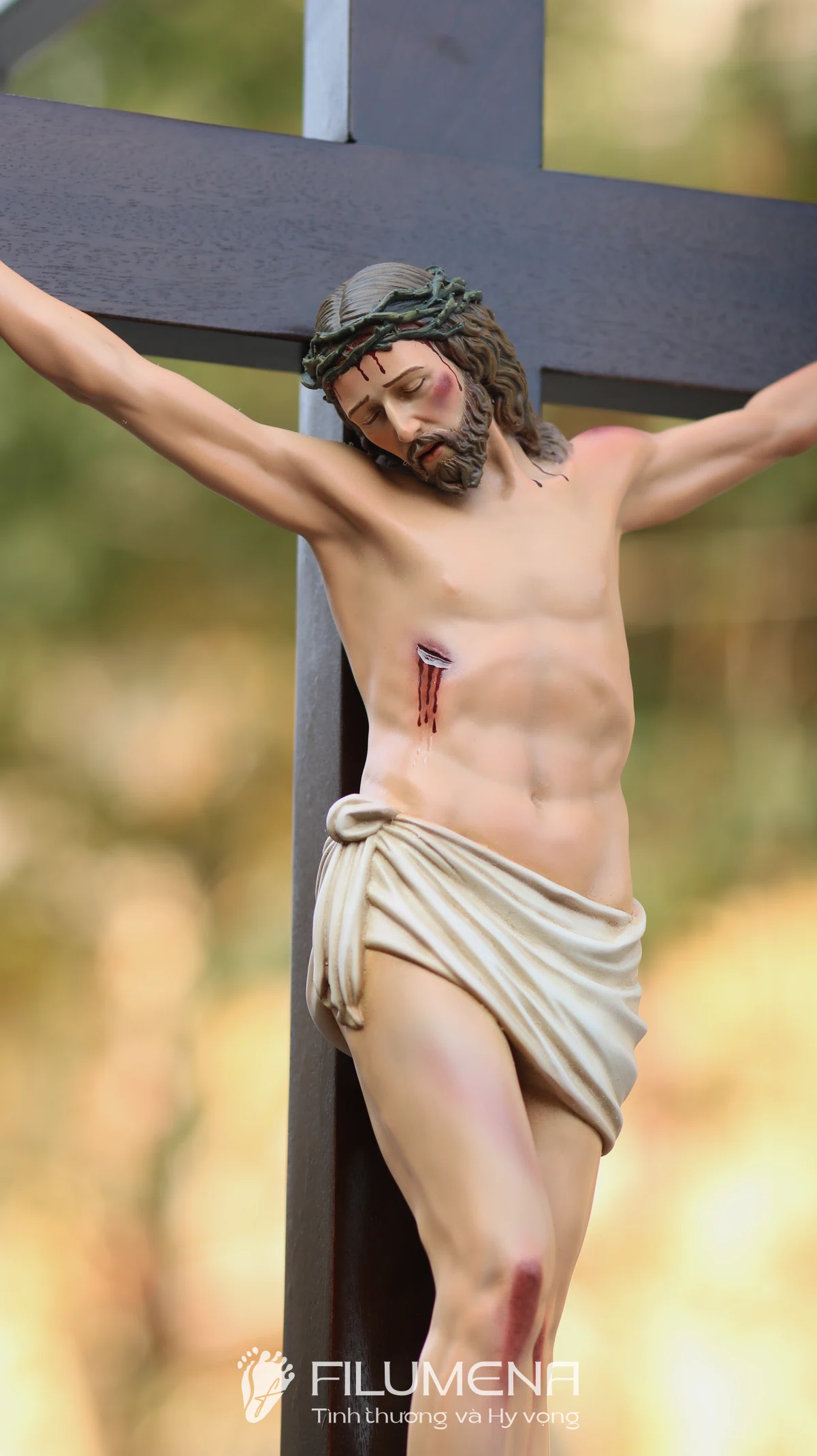 Tượng Chúa chịu nạn 40 cm trên thánh giá gỗ lát là điểm nhấn trang nghiêm cho bàn thờ gia đình, phòng khách hay nhà nguyện nhỏ. Thân mình Chúa được tạo tác cân đối, từng đường gân tay, vết đinh và ánh mắt hướng xuống nhân loại đều được khắc tả với sự tôn kính, giúp người chiêm ngắm dễ bước vào cầu nguyện và suy niệm về mầu nhiệm Thập giá.