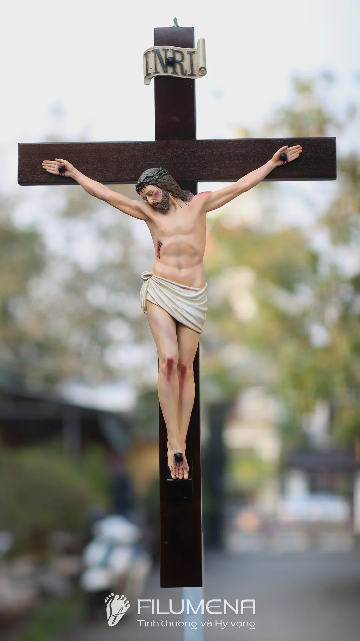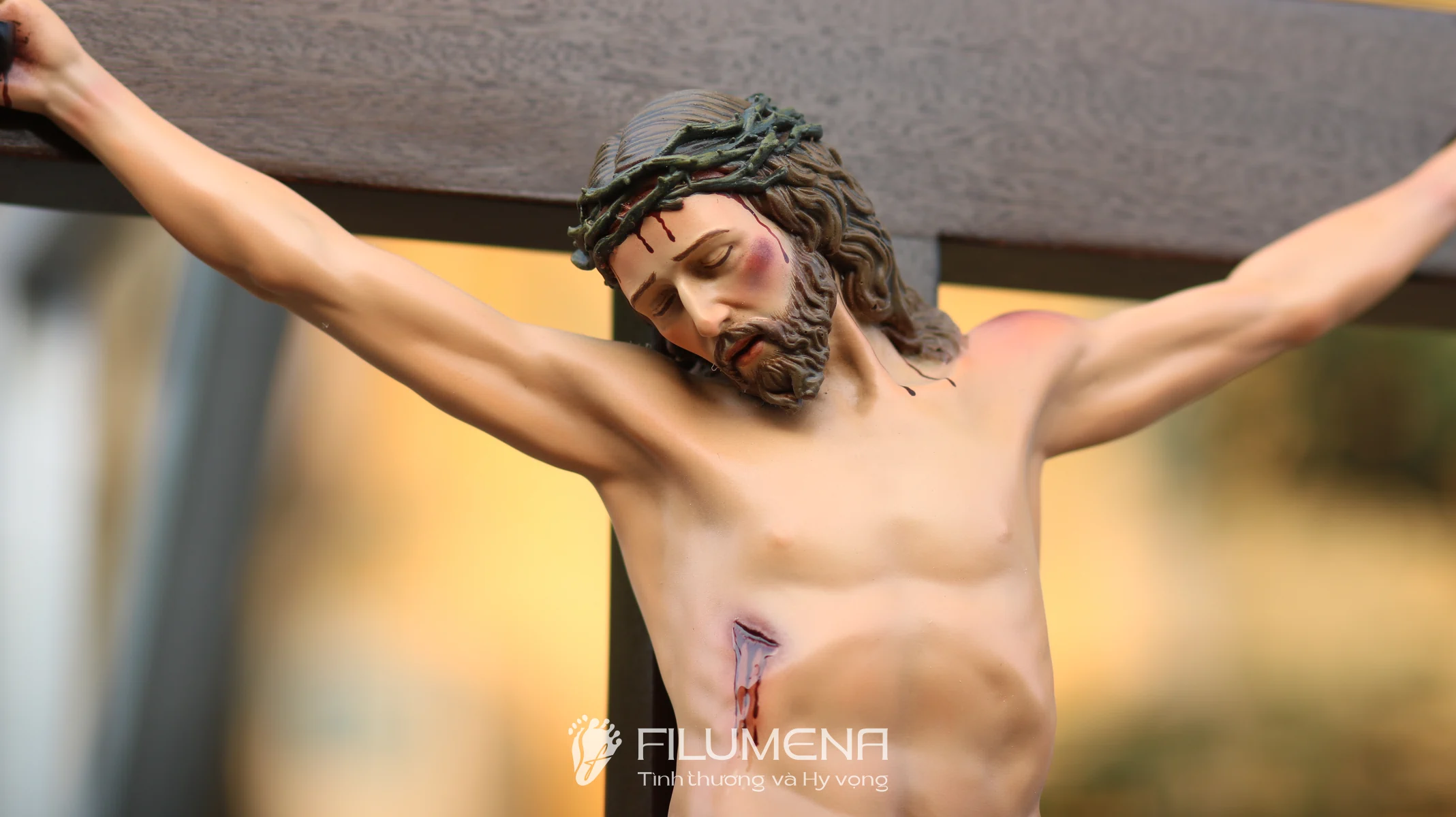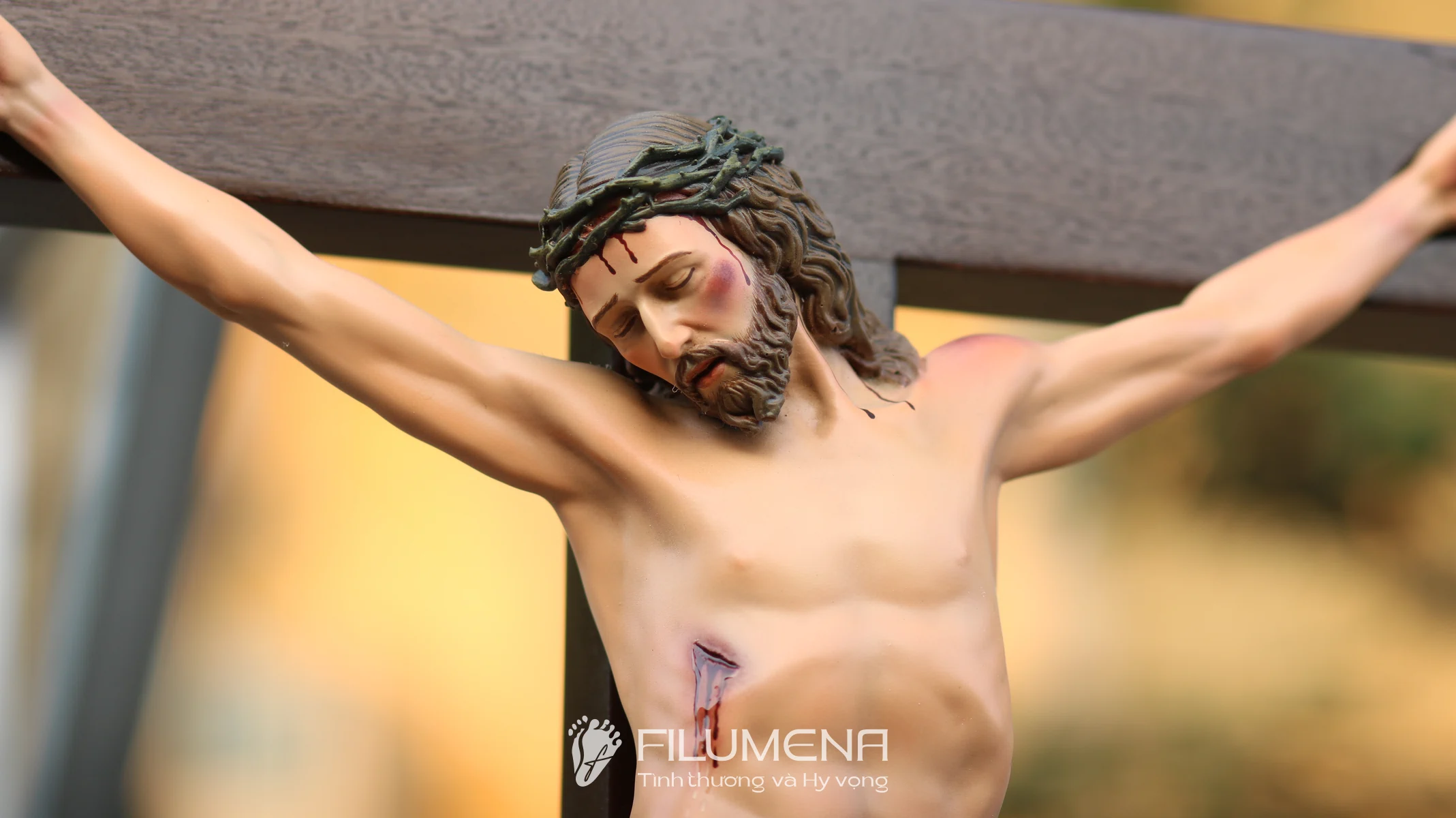 Tượng Chúa chịu nạn 40 cm trên thánh giá gỗ lát là điểm nhấn trang nghiêm cho bàn thờ gia đình, phòng khách hay nhà nguyện nhỏ. Thân mình Chúa được tạo tác cân đối, từng đường gân tay, vết đinh và ánh mắt hướng xuống nhân loại đều được khắc tả với sự tôn kính, giúp người chiêm ngắm dễ bước vào cầu nguyện và suy niệm về mầu nhiệm Thập giá.