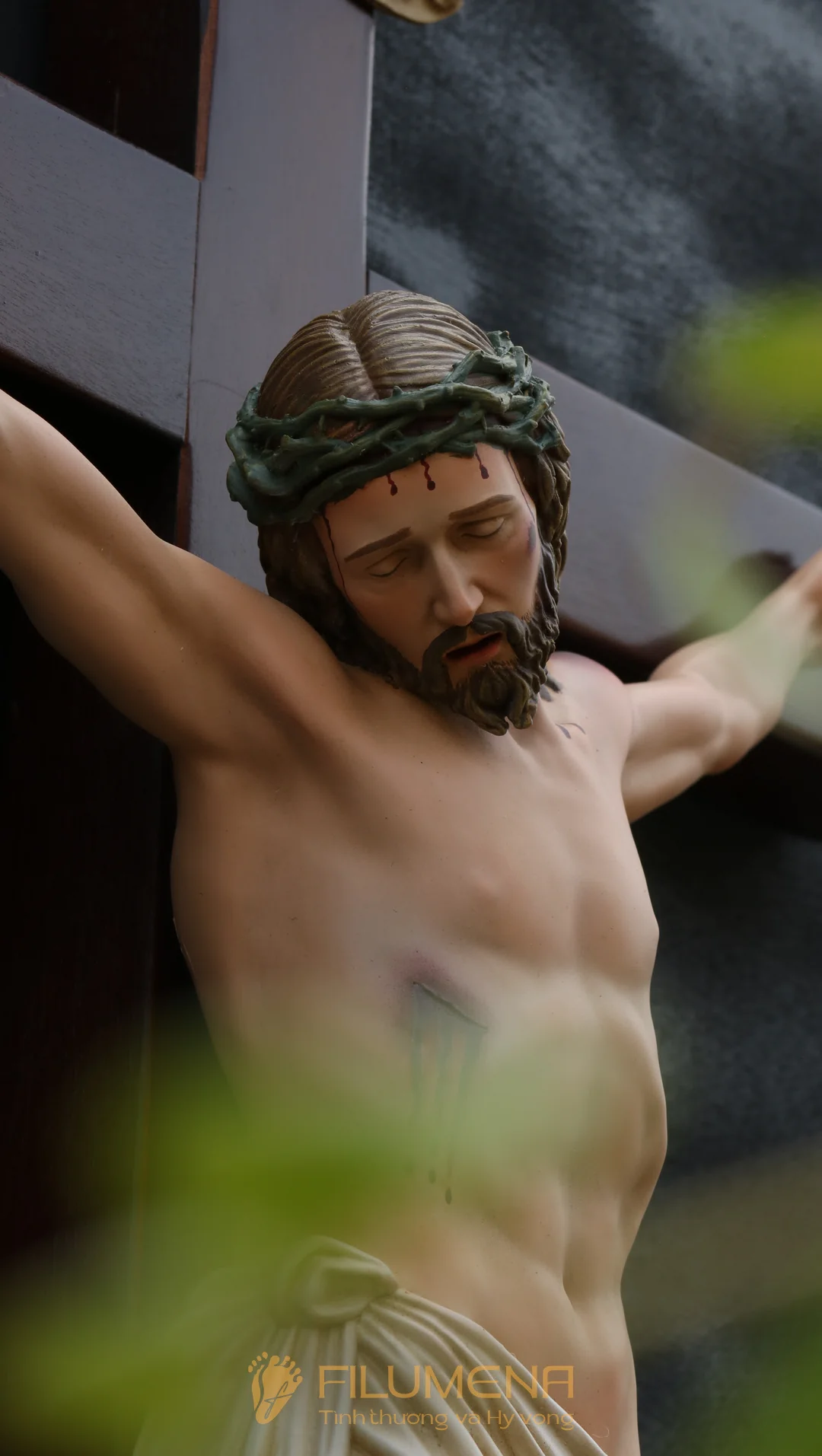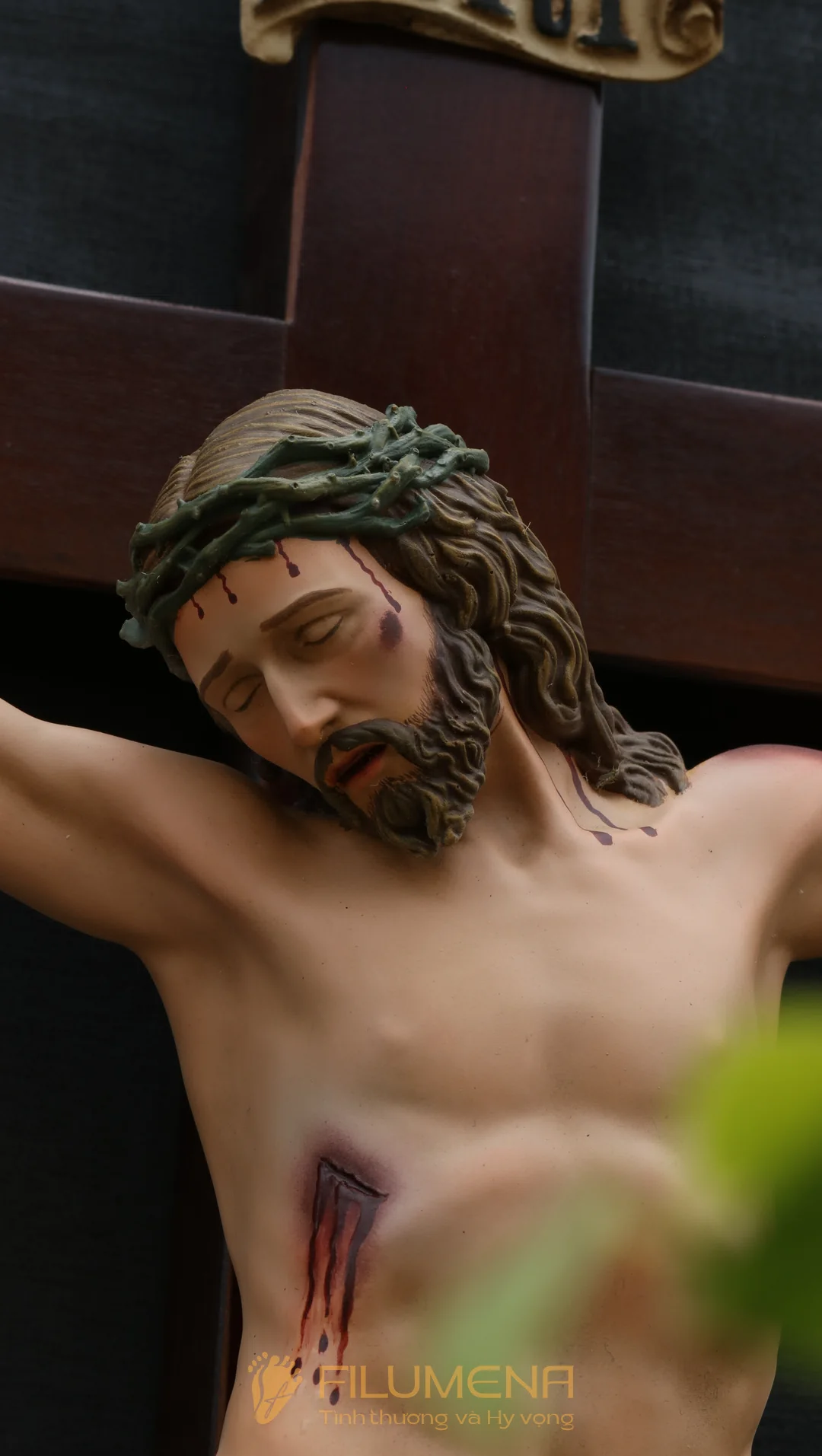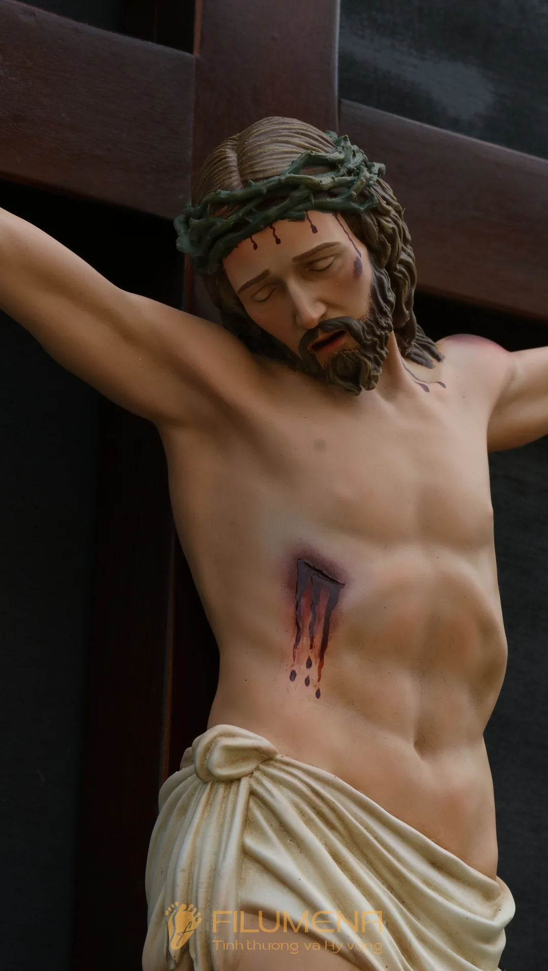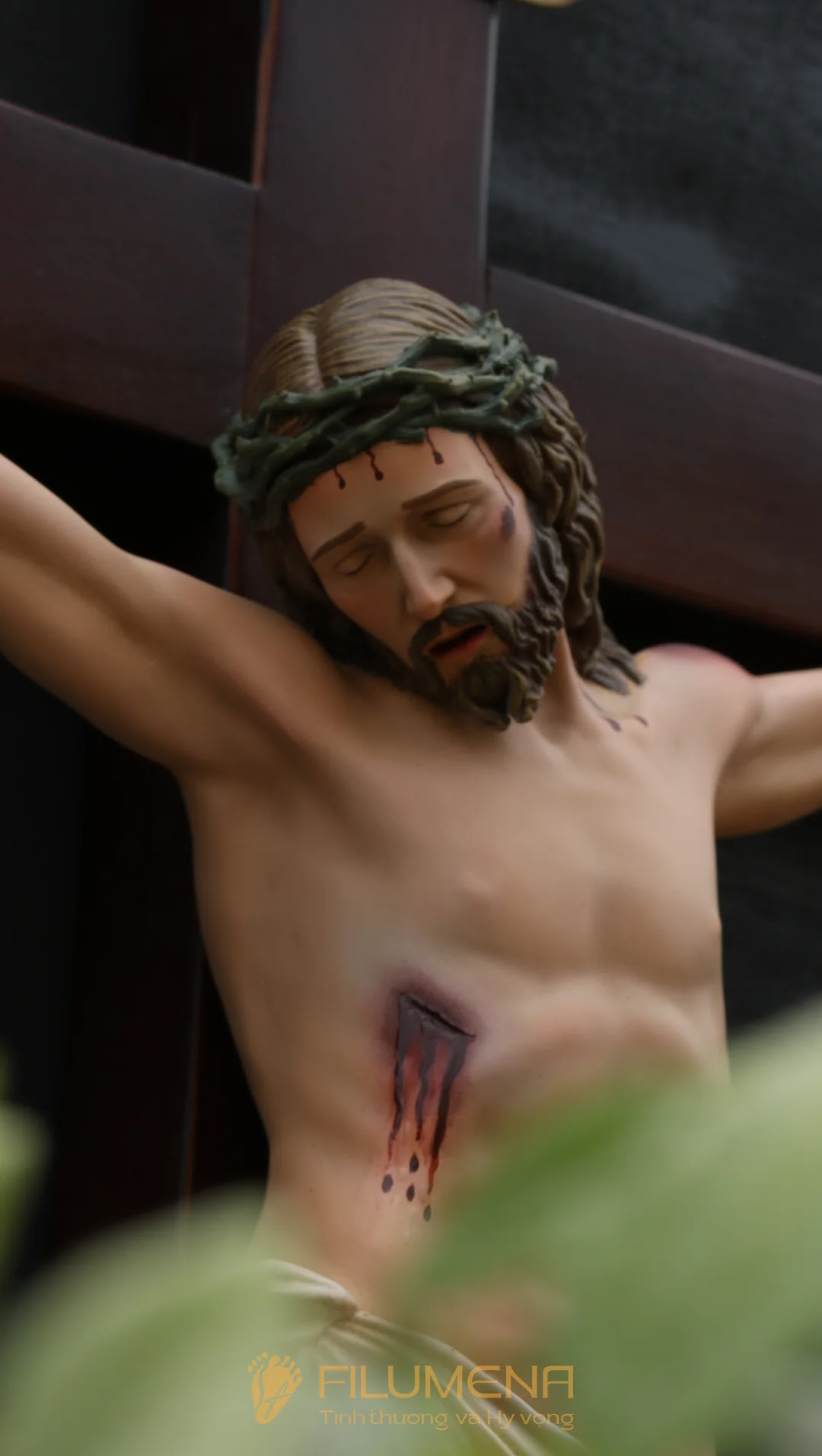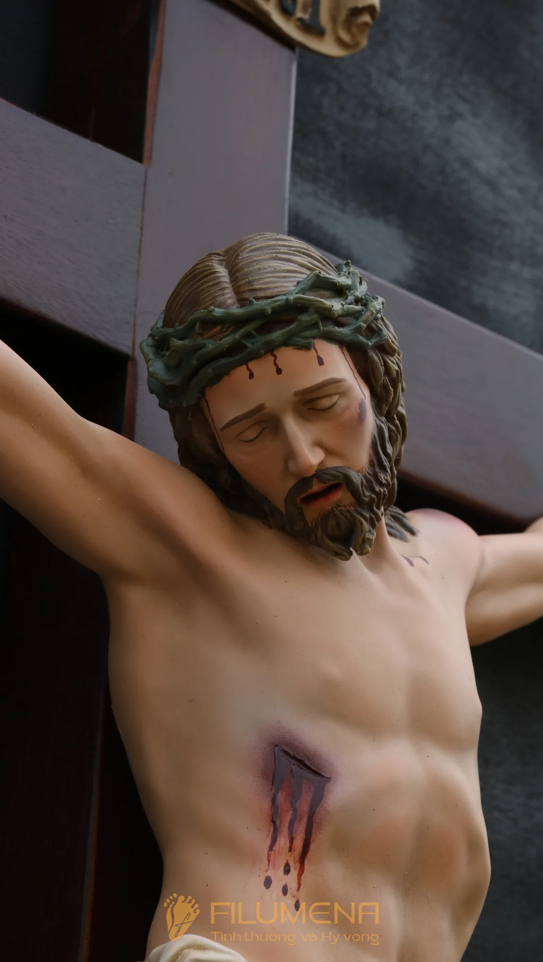 Tượng Chúa Chịu Nạn 60 cm bằng bột đá, gắn trên thánh giá gỗ lát (102 x 62 cm) – loại gỗ tốt, vân đẹp, bền chắc. Tác phẩm khắc họa giây phút Chúa Giêsu phó thác linh hồn trong tay Chúa Cha, là một trong bộ 3 tượng bàn thờ Công giáo Filumena, phù hợp treo trên bàn thờ gia đình hoặc phòng nguyện nhỏ. Mẫu tượng do Filumena sáng tác và dành 10% giá trị tác phẩm cùng ít nhất 25% lợi nhuận cho Quỹ Filumena Tình thương và Hy vọng, hỗ trợ Bảo vệ Sự sống và người nghèo.