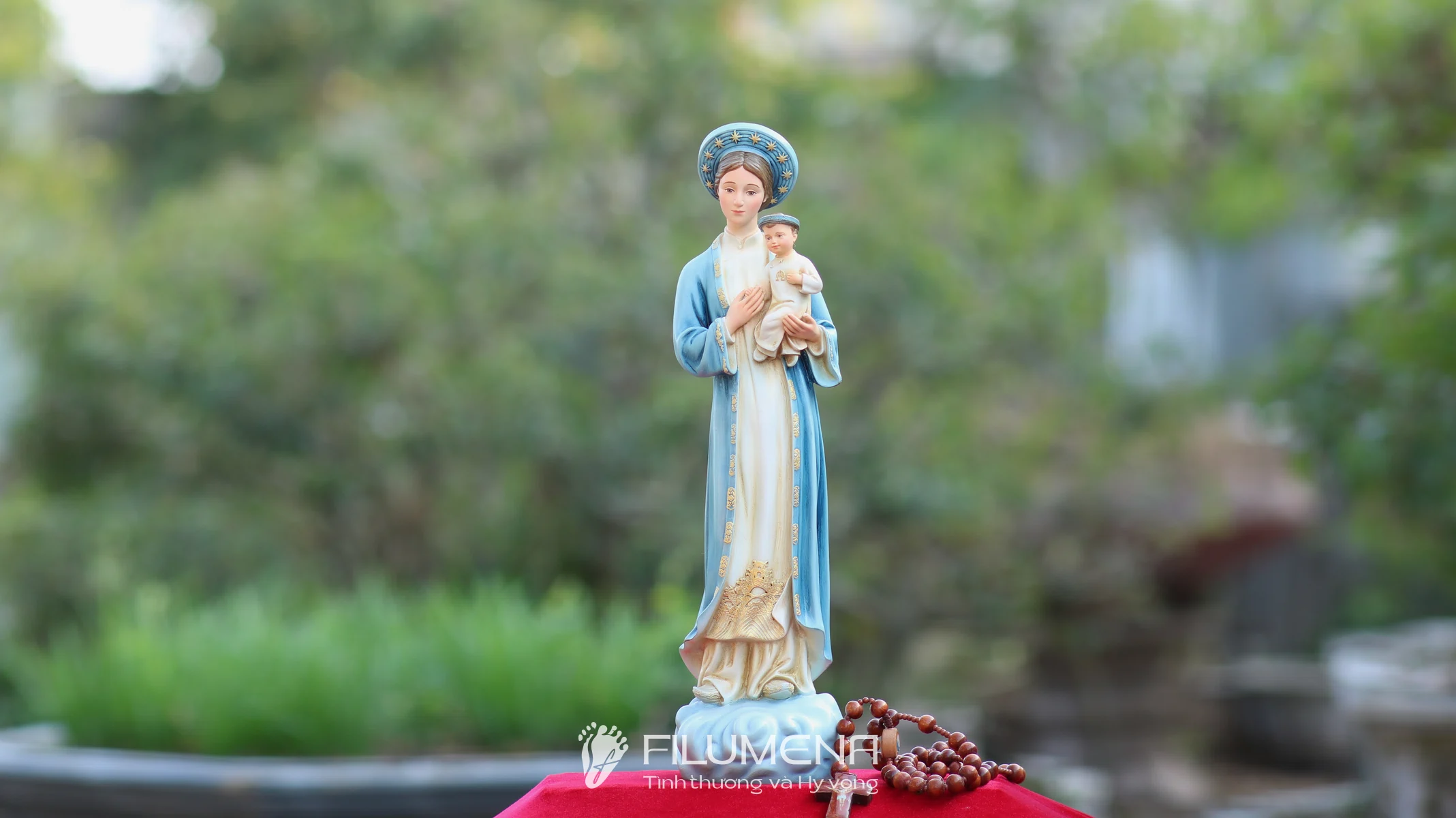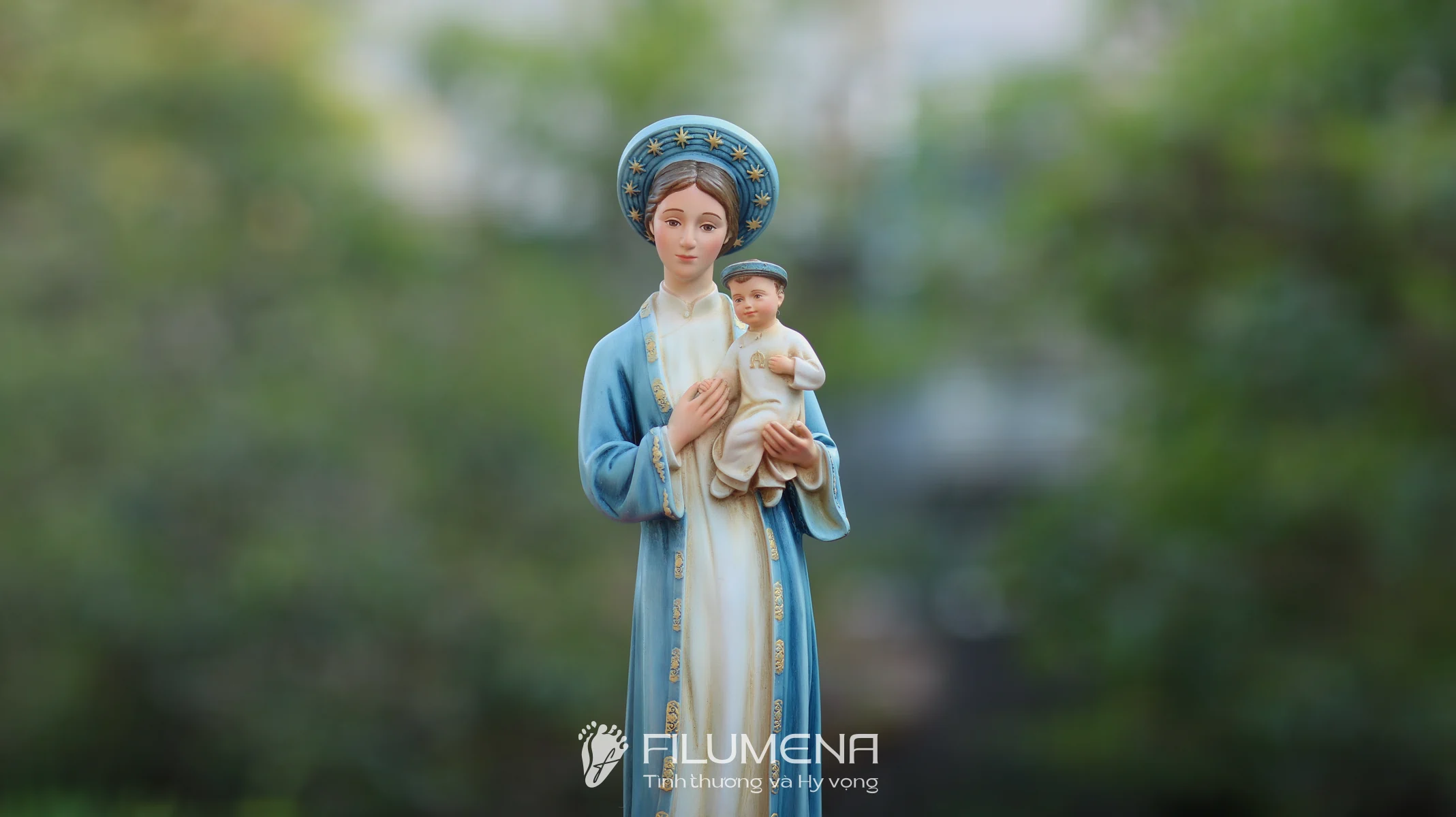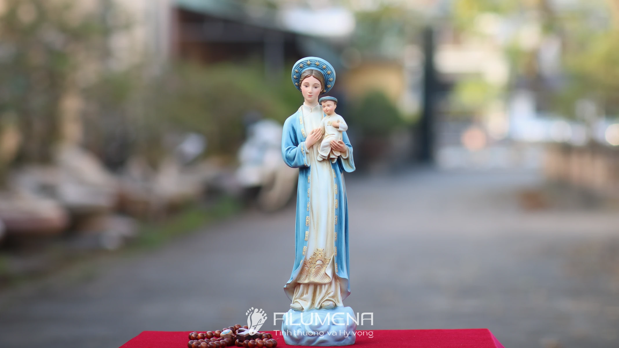 Tượng Đức Mẹ La Vang 40 cm do Filumena sáng tác, Mẹ mặc áo dài – khăn xếp, khoác áo choàng xanh da trời, bế Chúa Hài Đồng dịu hiền. Hoa văn trên áo được nghiên cứu từ họa tiết cổ phục nữ hoàng Việt Nam, vừa đúng lịch sử vừa thanh nhã, rất phù hợp đặt trên bàn thờ gia đình, kệ phòng khách hoặc góc cầu nguyện của người Công giáo Việt.
