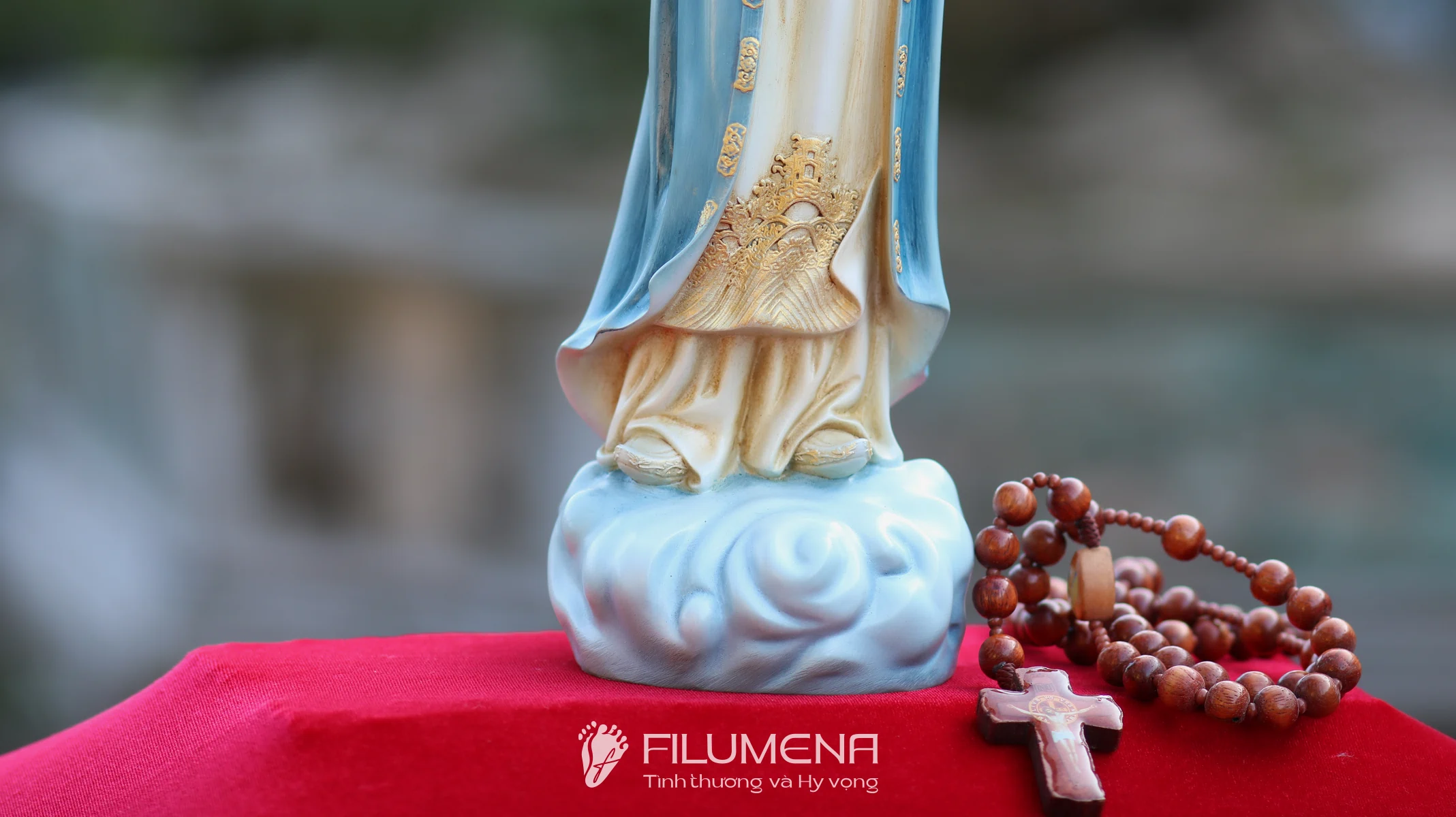 Tượng Đức Mẹ La Vang 40 cm là một trong những mẫu tượng mà Filumena dành rất nhiều tâm huyết, như một lời tri ân Đức Maria trong bối cảnh đức tin và văn hóa Việt Nam. Hình ảnh Mẹ hiện ra giữa rừng La Vang năm xưa được diễn tả bằng ngôn ngữ rất Việt: Mẹ mặc áo dài, đội khăn xếp, khoác áo choàng xanh da trời – sắc màu truyền thống gắn liền với các ảnh tượng Đức Mẹ trong phụng vụ, nhưng được đặt trọn vẹn trong đường nét cổ phục Việt.