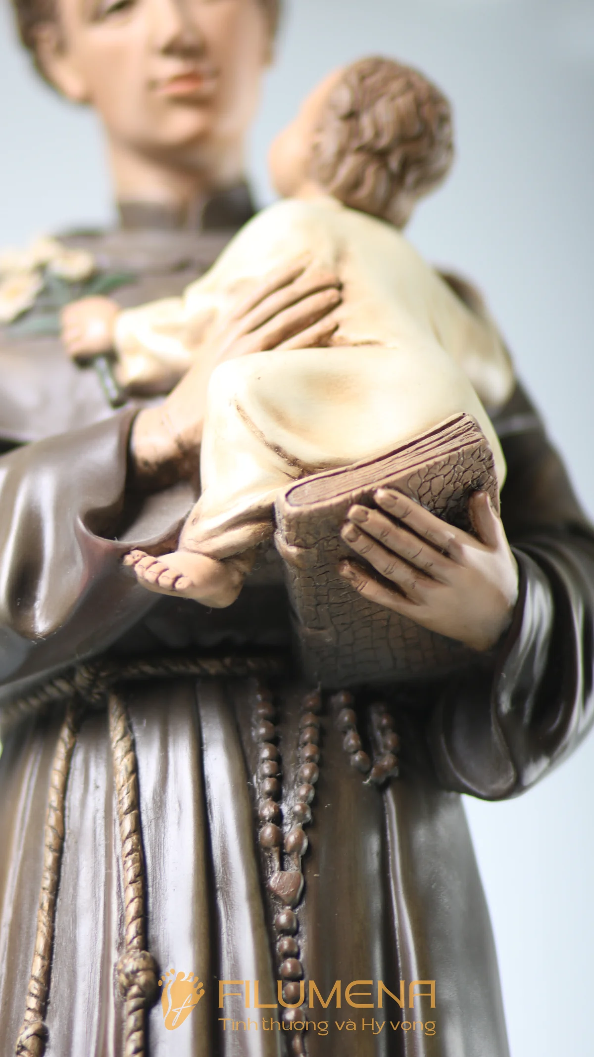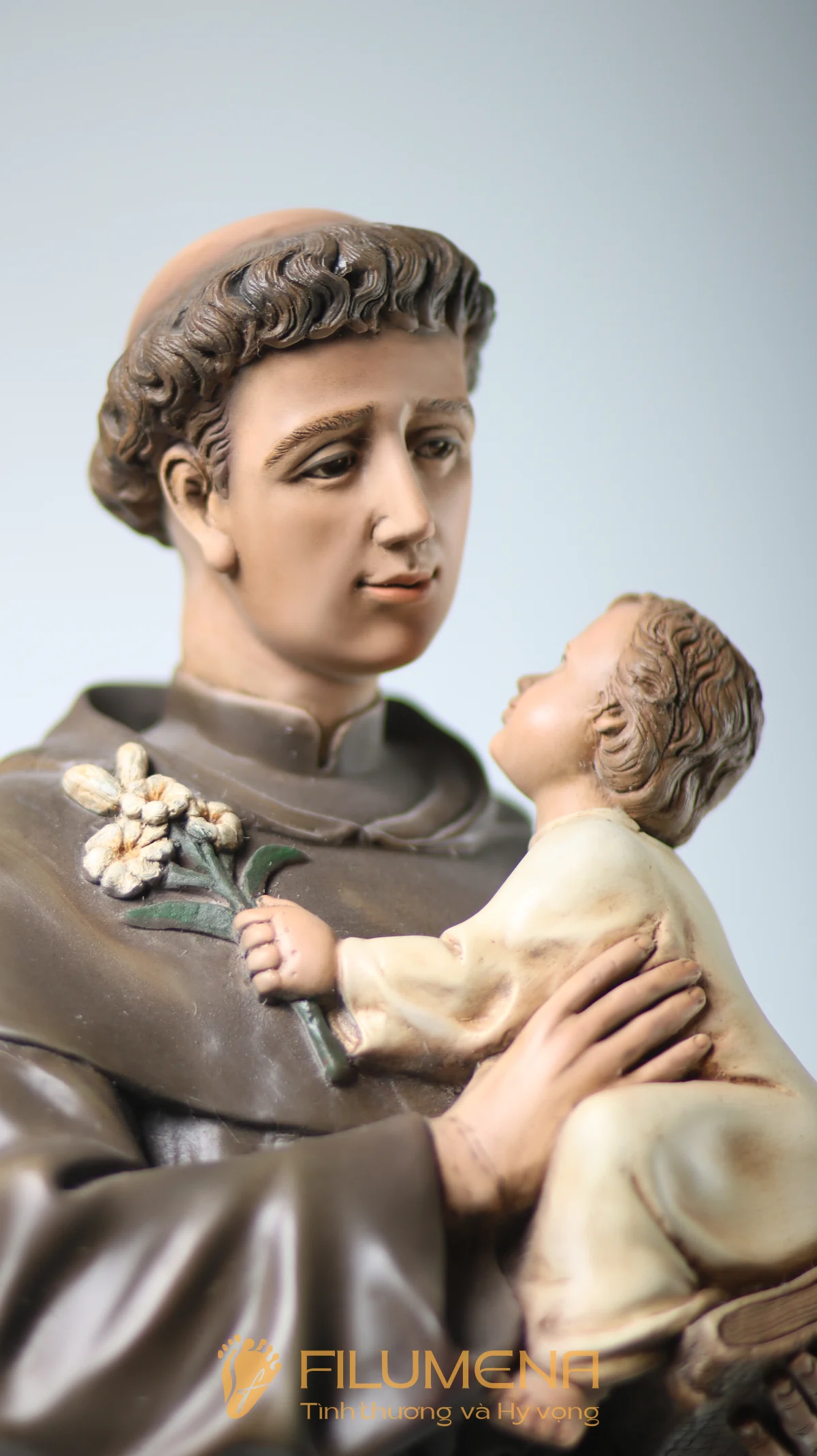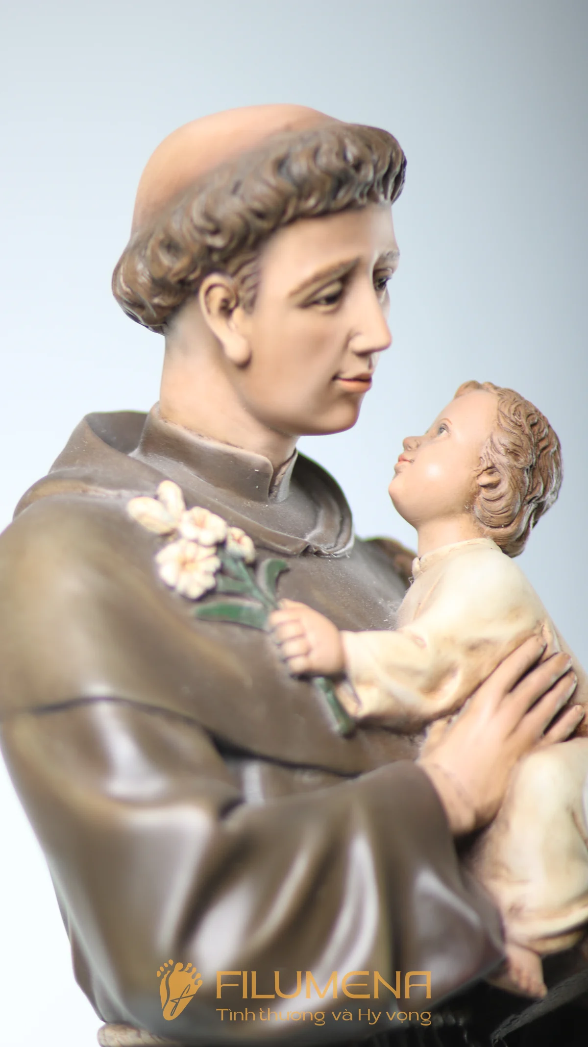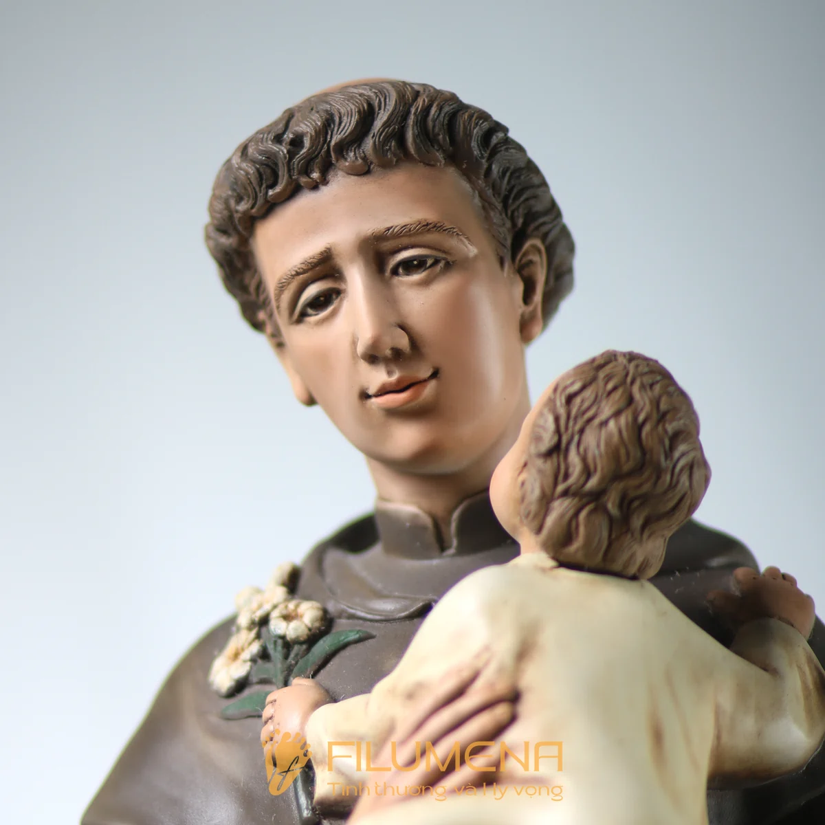 Tượng Thánh Antôn bế Chúa Hài Đồng do Filumena sáng tác khắc họa hình ảnh quen thuộc nhưng luôn đầy xúc động: Thánh Antôn trong tu phục hiền hòa, tay ôm Chúa Hài Đồng và nâng quyển Kinh Thánh sát vào lòng. Trên tay Chúa là nhành hoa huệ trắng, biểu tượng của sự thanh khiết và tình yêu trong sáng. Ánh mắt Chúa Hài Đồng hướng về Thánh Antôn cách trìu mến, như một cuộc đối thoại thinh lặng giữa Đấng Cứu Thế và người môn đệ hiền lành.