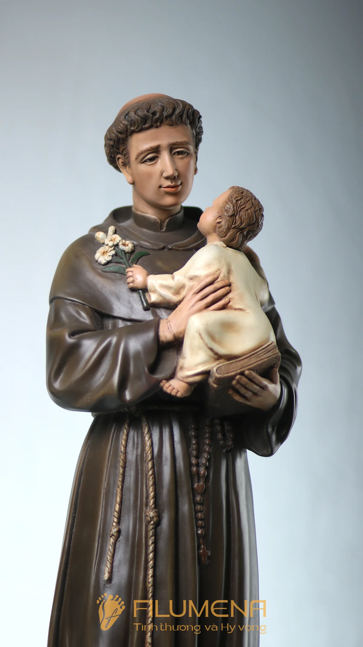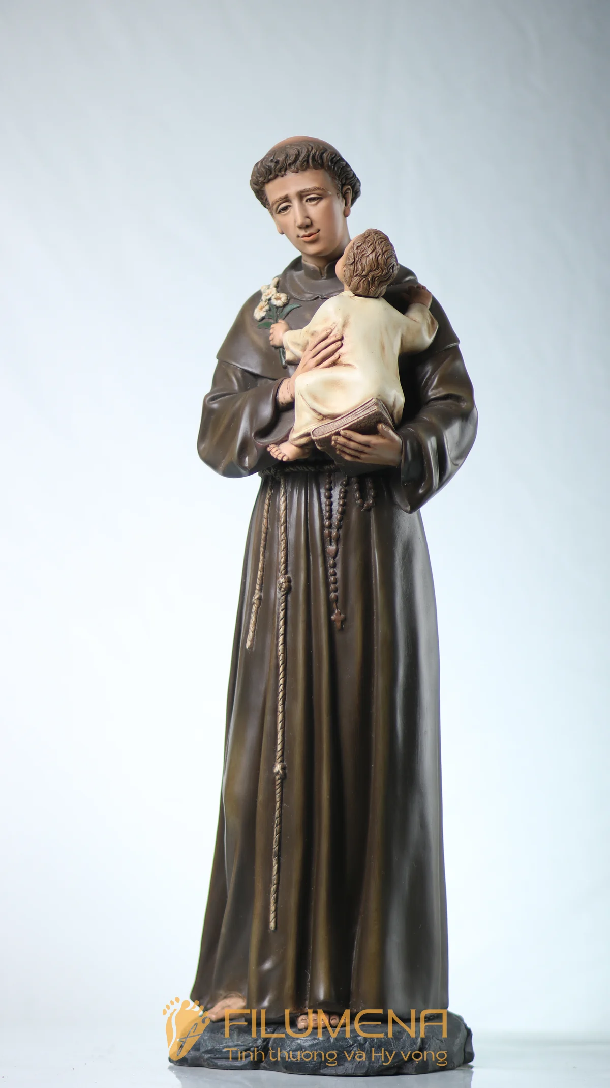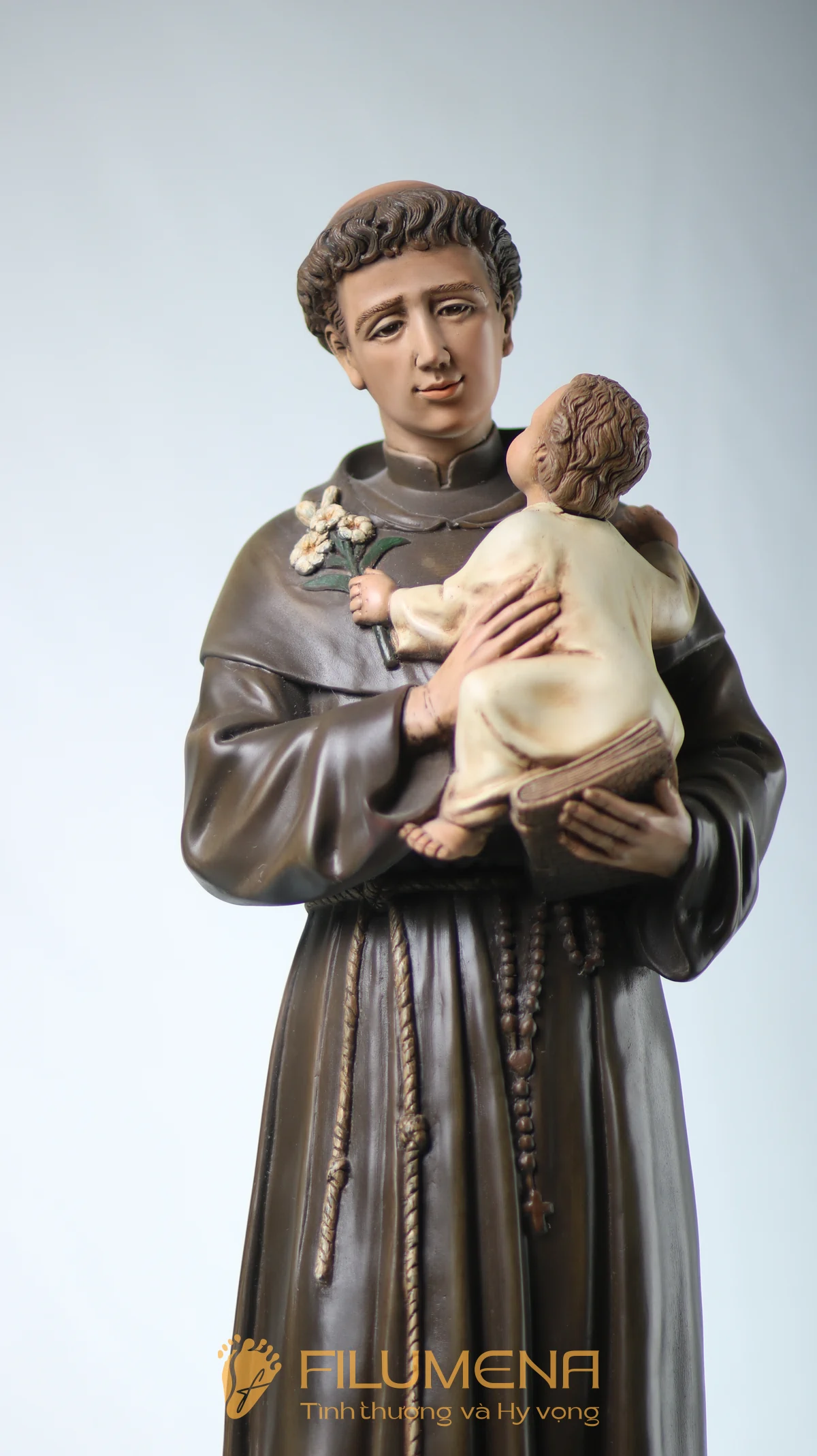 Tượng Thánh Antôn bế Chúa Hài Đồng do Filumena sáng tác khắc họa hình ảnh quen thuộc nhưng luôn đầy xúc động: Thánh Antôn trong tu phục hiền hòa, tay ôm Chúa Hài Đồng và nâng quyển Kinh Thánh sát vào lòng. Trên tay Chúa là nhành hoa huệ trắng, biểu tượng của sự thanh khiết và tình yêu trong sáng. Ánh mắt Chúa Hài Đồng hướng về Thánh Antôn cách trìu mến, như một cuộc đối thoại thinh lặng giữa Đấng Cứu Thế và người môn đệ hiền lành. Tượng cao 63 cm.