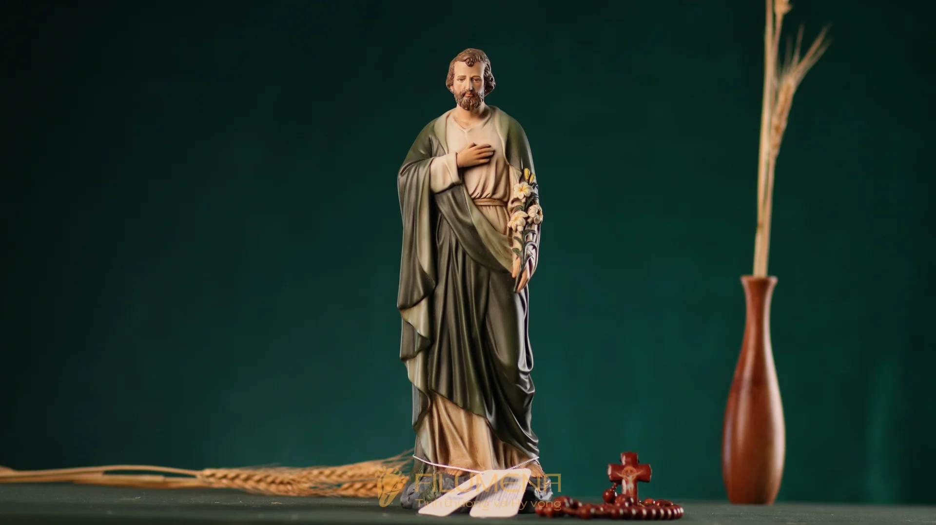 Tượng Thánh Giuse hoa huệ cao 40 cm với áo màu xanh ô-liu.