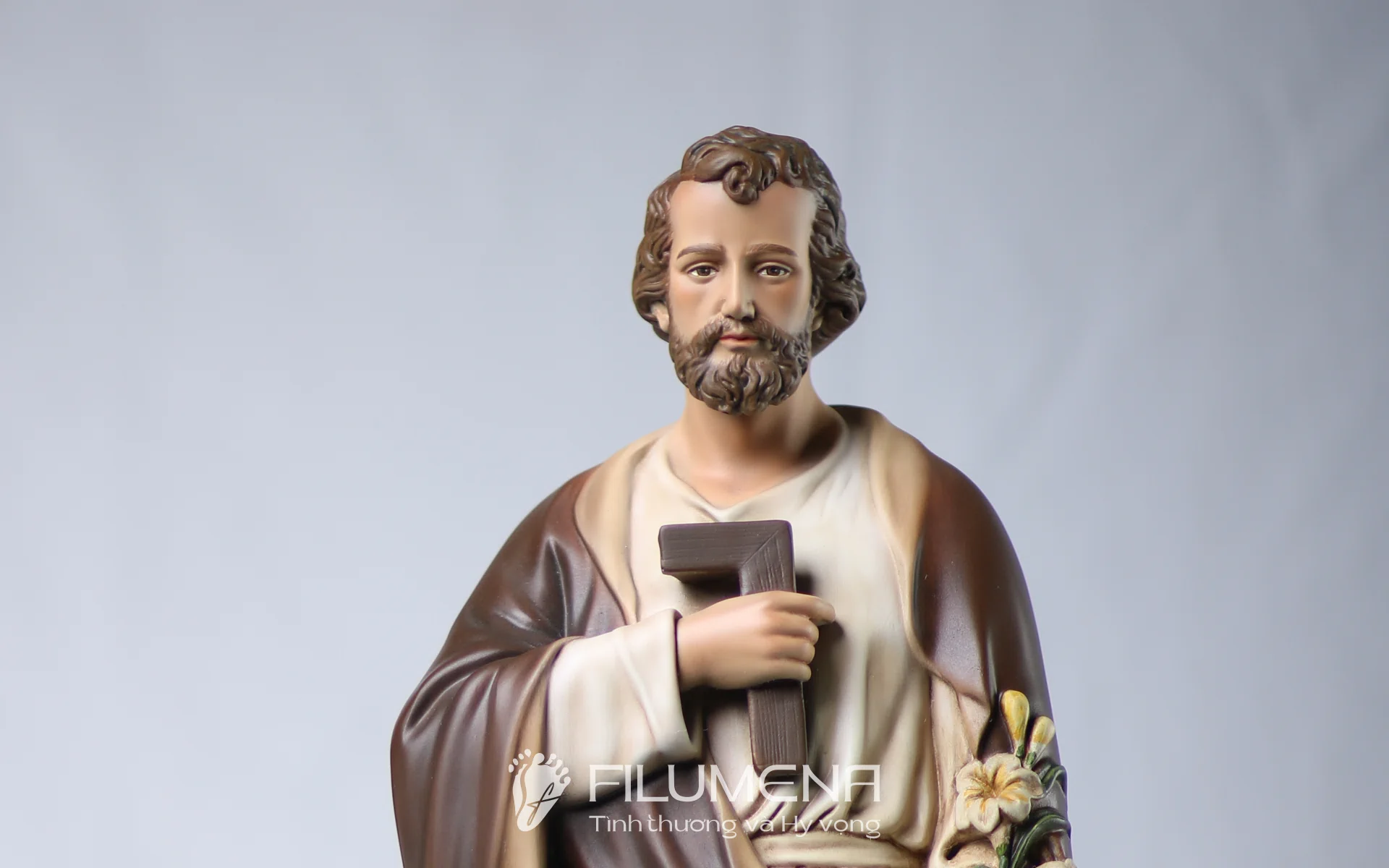 Tượng Thánh Giuse Thợ cao 50 cm, 60 cm với áo màu nâu trắng truyền thống.