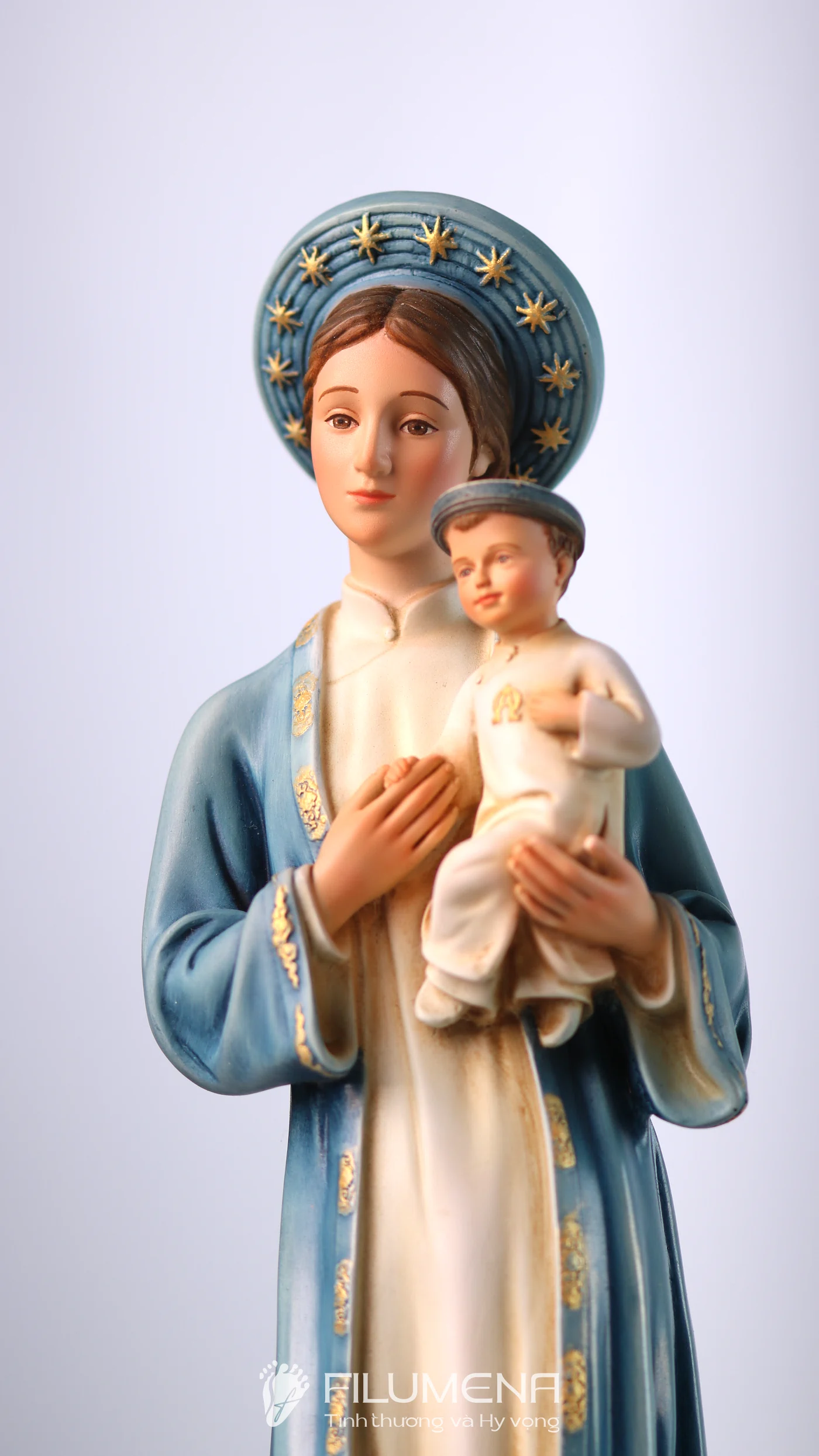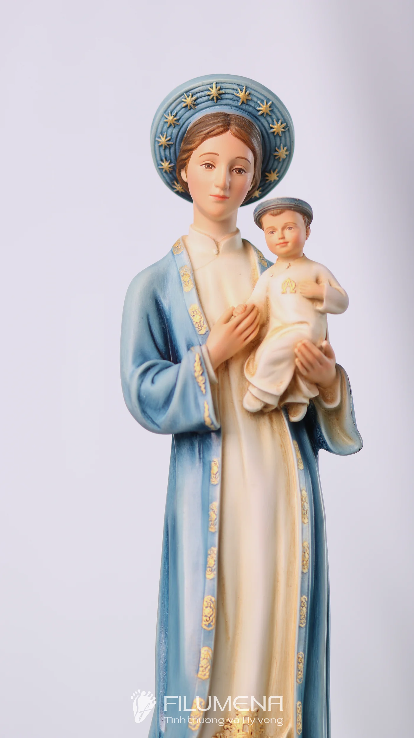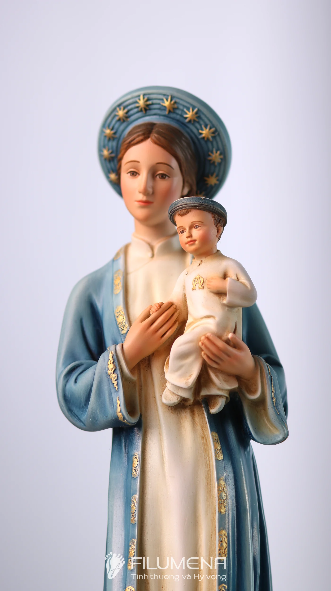 Tượng Đức Mẹ La Vang diễn tả Mẹ trong áo dài – khăn đóng mang đậm văn hóa Việt, dấu chỉ Mẹ ở cùng con dân giữa gian nan. Hình tượng này mời gọi gia đình tín thác, cậy trông và học nơi Mẹ sự dịu hiền kiên vững. Filumena giữ thần thái gần gũi, tỷ lệ hài hòa và sắc độ tiết chế để việc chiêm ngắm dẫn vào cầu nguyện hằng ngày.