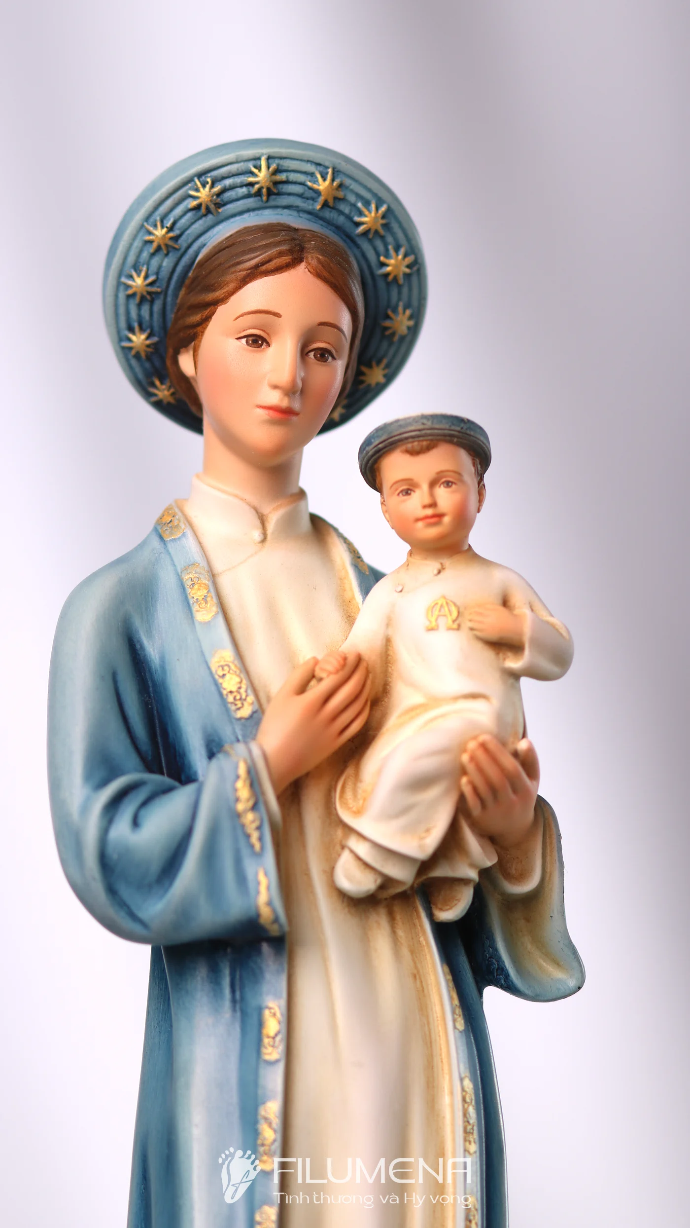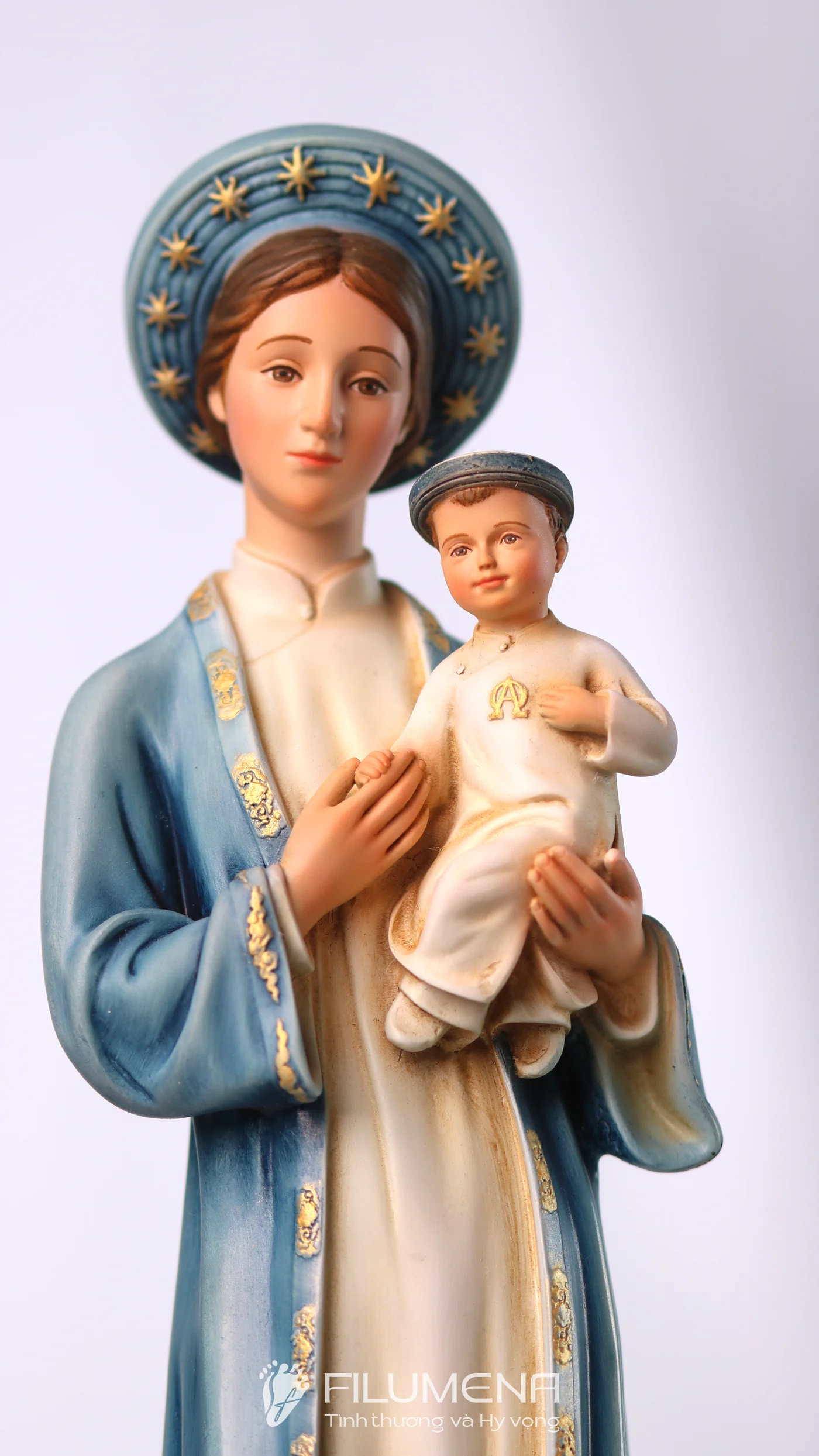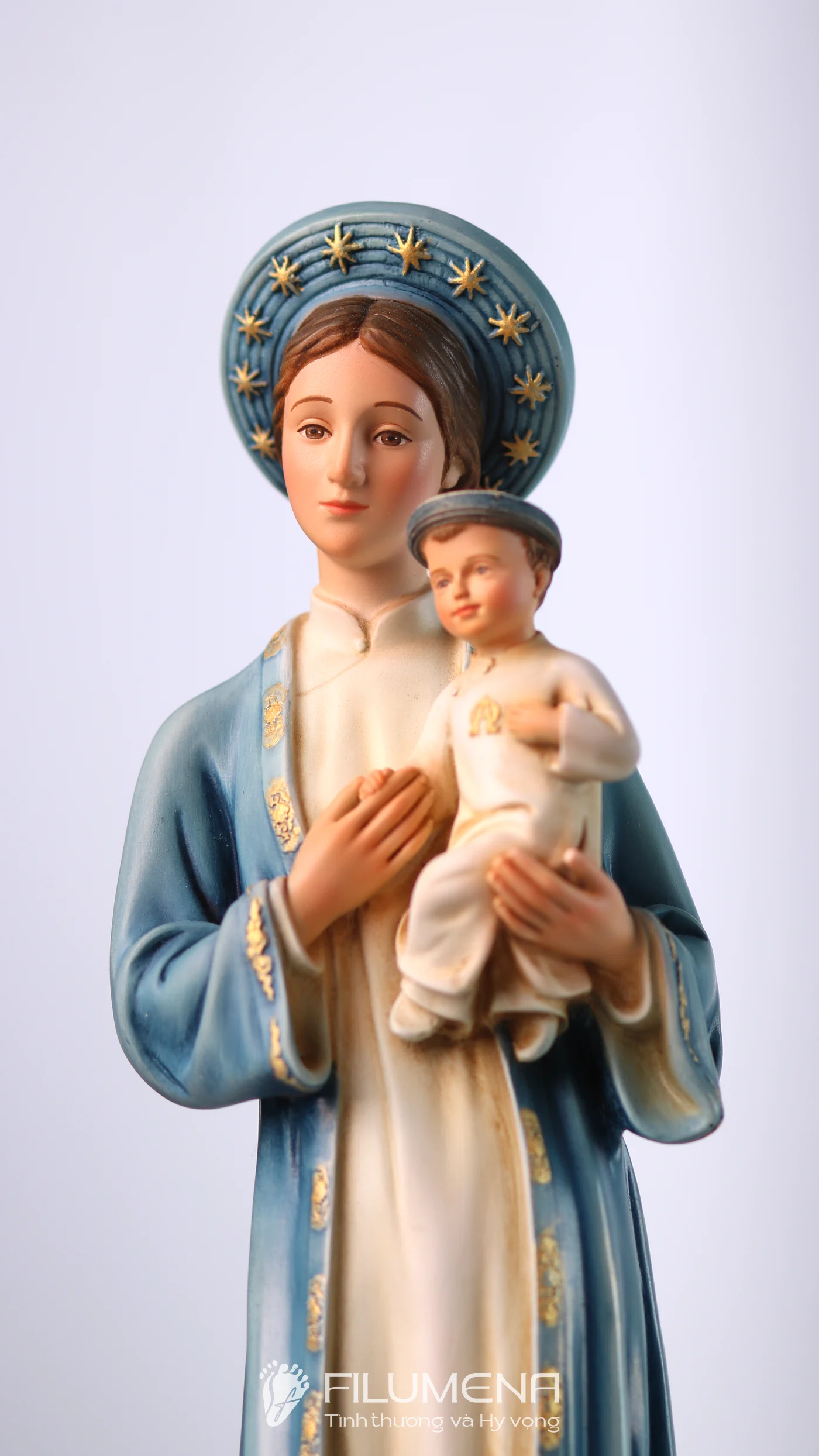 Tượng Đức Mẹ La Vang diễn tả Mẹ trong áo dài – khăn đóng mang đậm văn hóa Việt, dấu chỉ Mẹ ở cùng con dân giữa gian nan. Hình tượng này mời gọi gia đình tín thác, cậy trông và học nơi Mẹ sự dịu hiền kiên vững. Filumena giữ thần thái gần gũi, tỷ lệ hài hòa và sắc độ tiết chế để việc chiêm ngắm dẫn vào cầu nguyện hằng ngày.